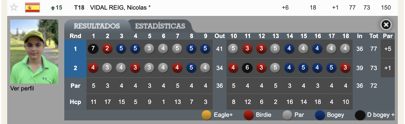 Reseteó de maravilla Nicolás, puesto que comenzaba su segunda vuelta igual que la primera con birdie, al que le siguieron todo pares salvo el 4 y el 7 a los que le sacó el birdie y el 17 (hoyo 8 del recorrido) en el que pagaba peaje con un bogey para un total de 73 (+1 de campo).