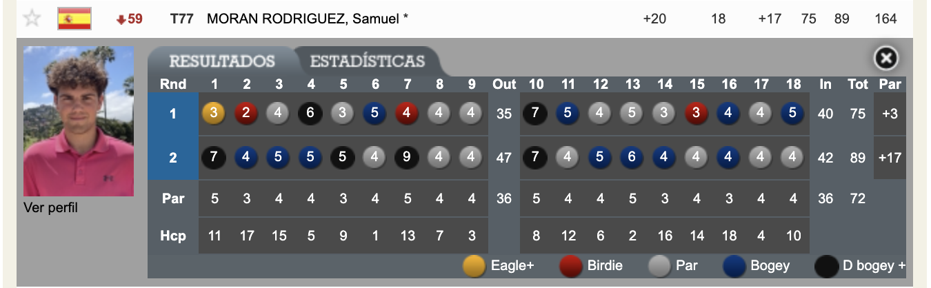 Tan solo 4 pares en toda la ronda, con 1 cuádruple bogey, 3 dobles bogeys y 7 bogeys, haciendo que Samuel no pudiera en ningún momento enderezar el rumbo.